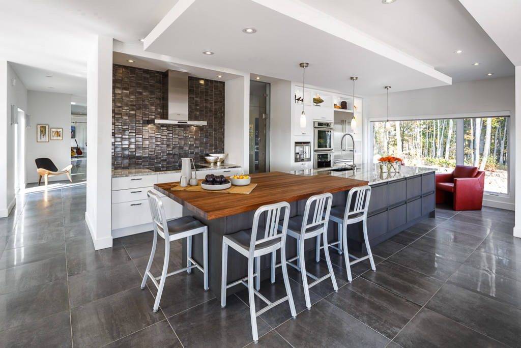 В просторных кухнях в частном доме можно позволить себе эксперименты со способом укладки, цветом и рисунком. Но помните, что «нарядным» в интерьере должно быть что-то одно.