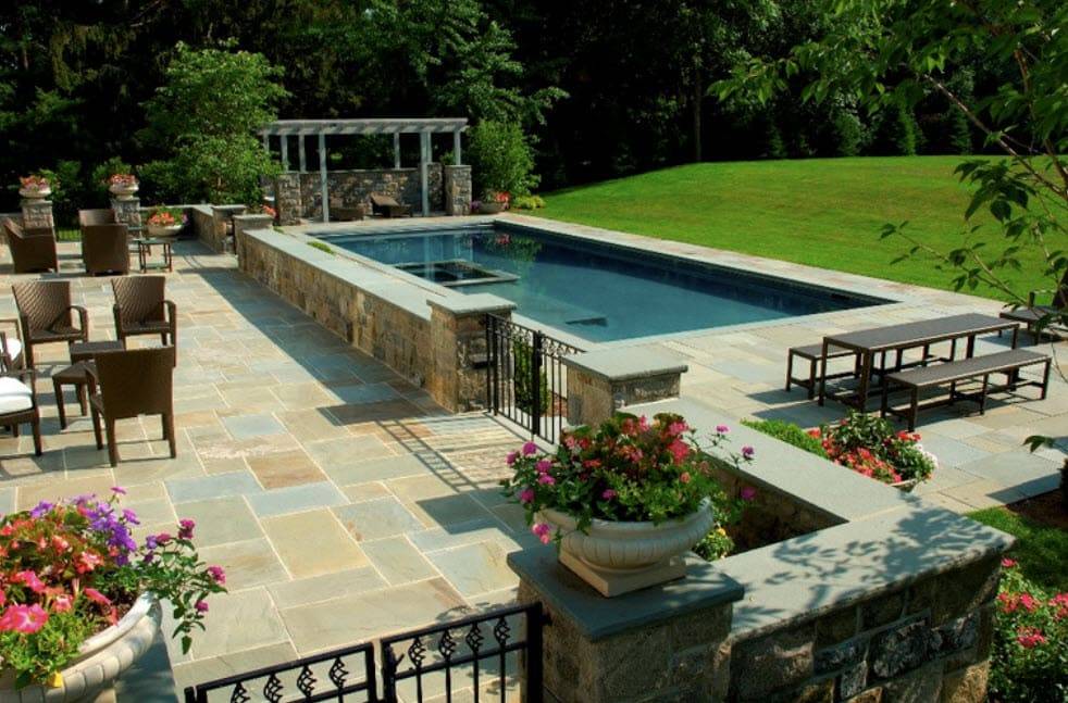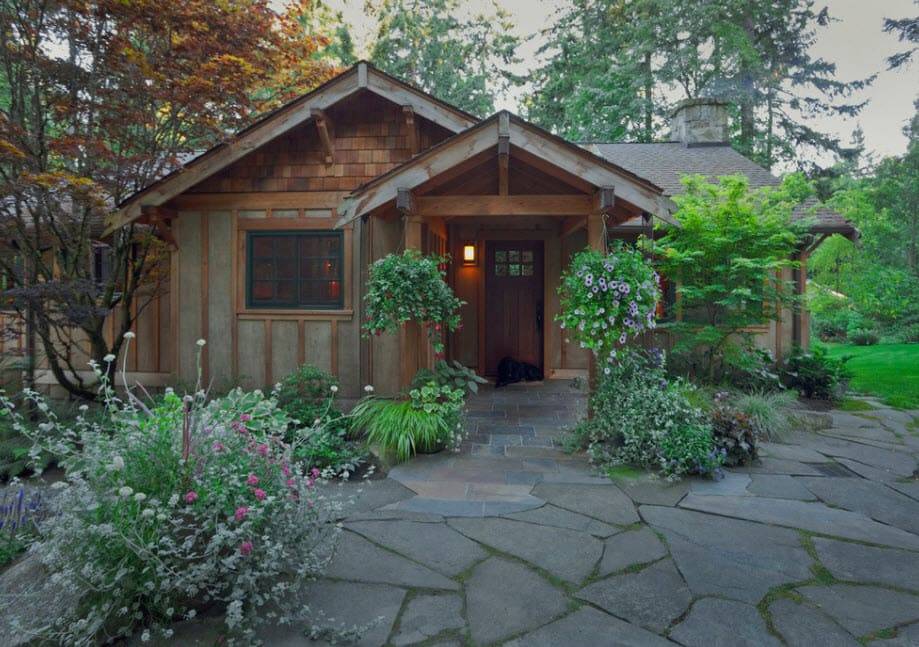 — Стиль кантри или прованс. Красивый двор при недорогом дачном домике, каркасном коттедже или даже деревенском доме получится в стиле кантри или прованс. Здесь принято комбинировать такие материалы, как дерево (коричневое — в кантри и серо-белое — в провансе) с натуральным камнем (коричневым и серым, соответственно). На основе этого контрастного сочетания и строится весь дизайн-проект сада, который обычно включает в себя навесы, перголы, аллеи, пейзажные клумбы и миксбордеры. Кантри и прованс, как правило, подходят для дачных домов и недорогих коттеджей.