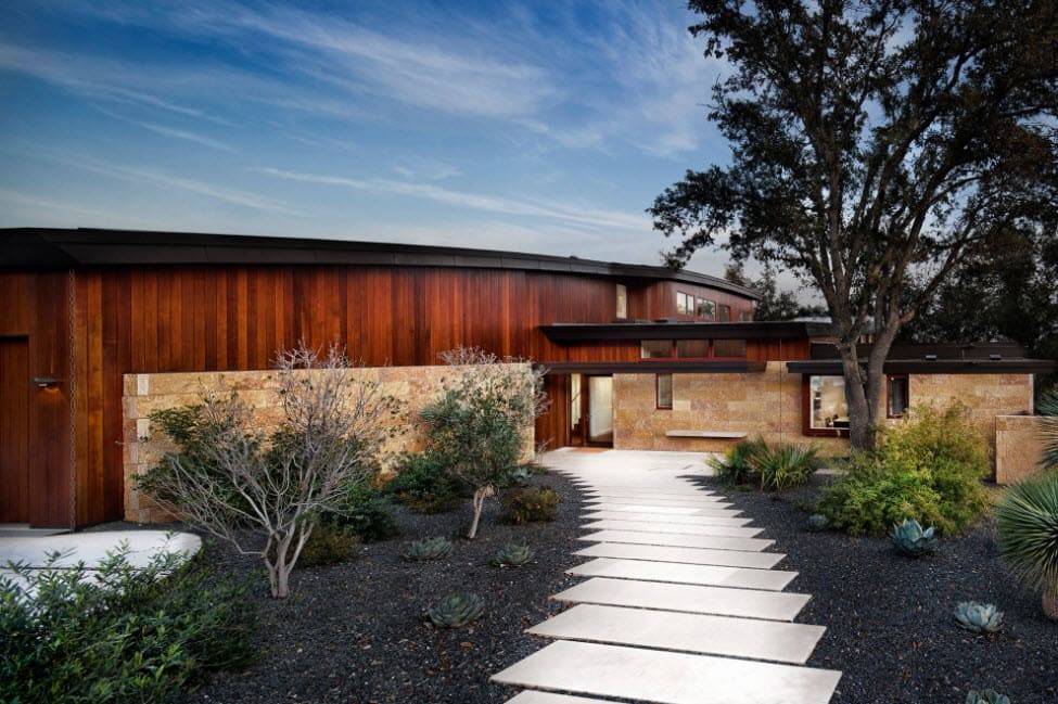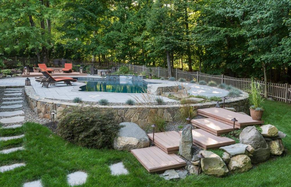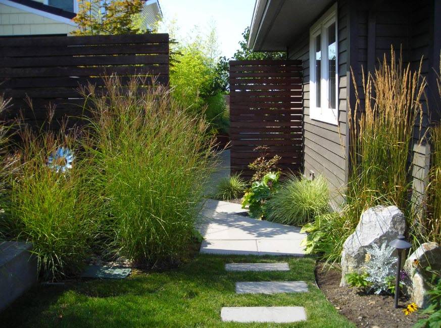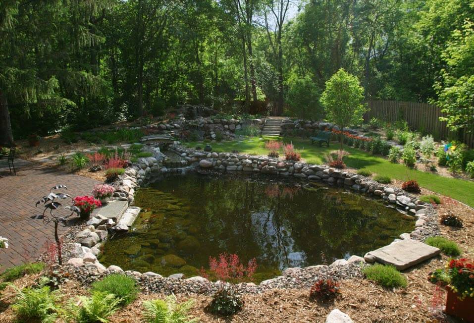 — Азиатский (восточный, японский) стиль. Дизайн в японском стиле для двора частного дома обычно изобилует маленькими террасами вокруг дома, их здесь несколько разных форм и размеров. Также популярны многоуровневые террасы вокруг декоративного водоема с рыбками, а растения принято выбирать декоративнолиственные, а не цветущие. Азиатский стиль лучше всего смотрится при минималистичных или современных домах.