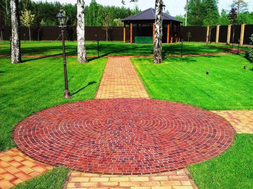 Круглые площадки легче оформлять с помощью плитки небольшого размера