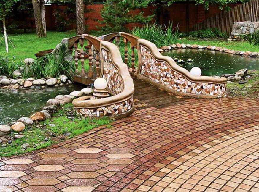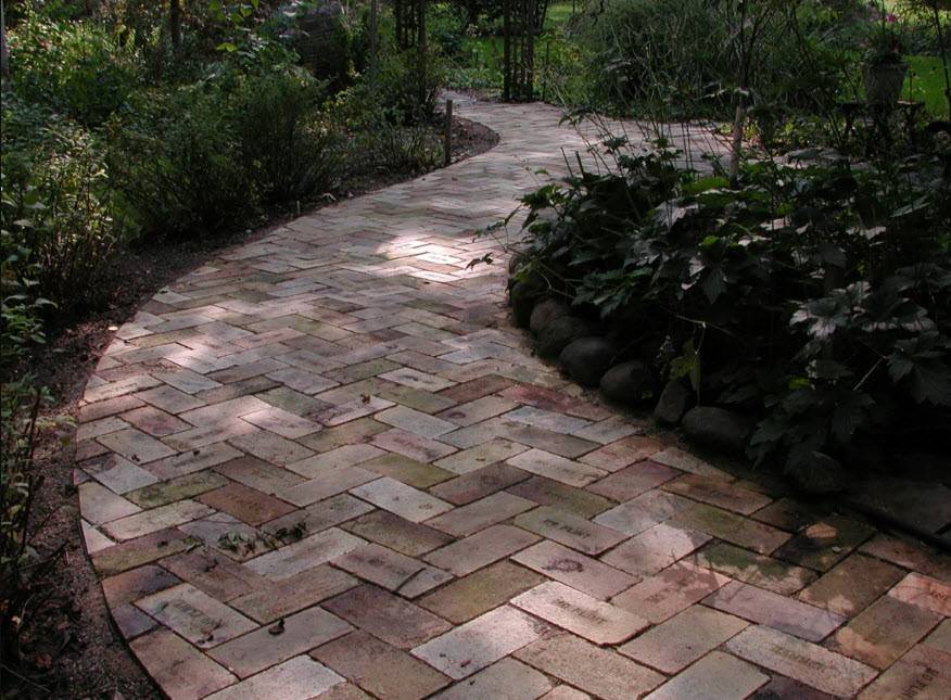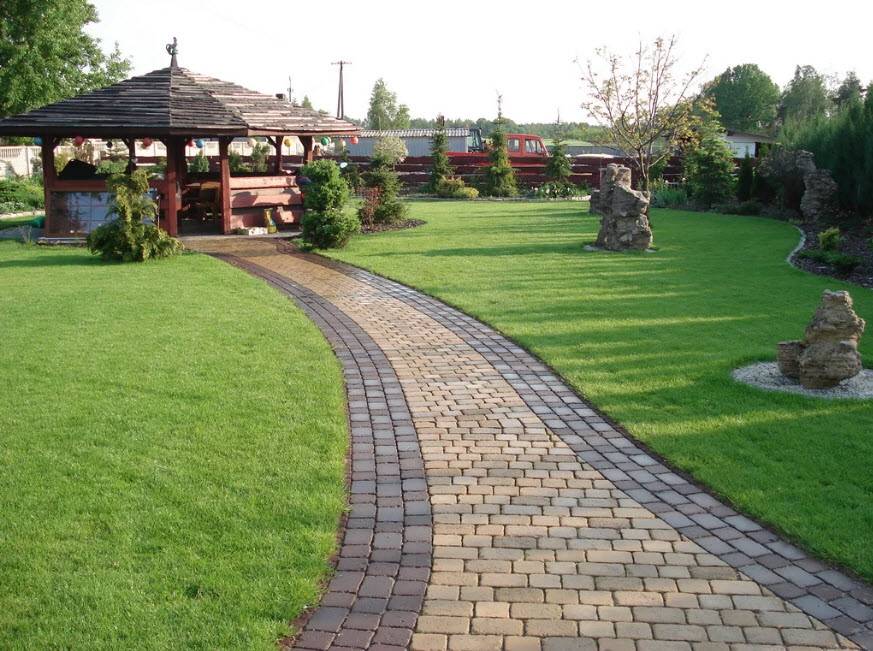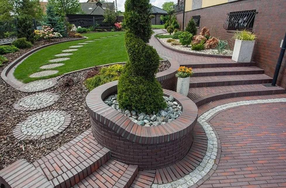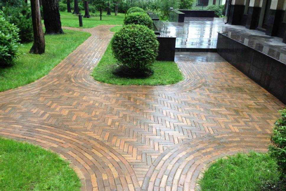 Извилистые и радиусные участки очень удобно оформлять, используя «кирпичик». Этот материал отлично подходит даже для территорий с перекрестками, перепадами высоты и узкими тропинками. Чтобы не было проблем с их оформлением, надо заранее нарисовать эскиз в масштабе, продумав все мелкие детали.