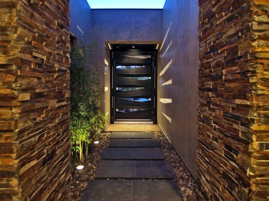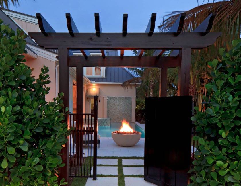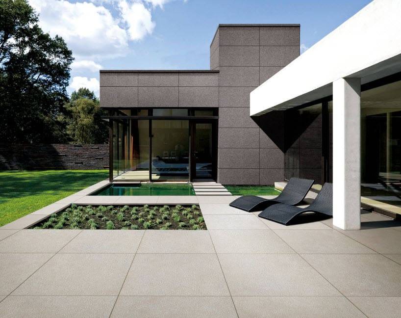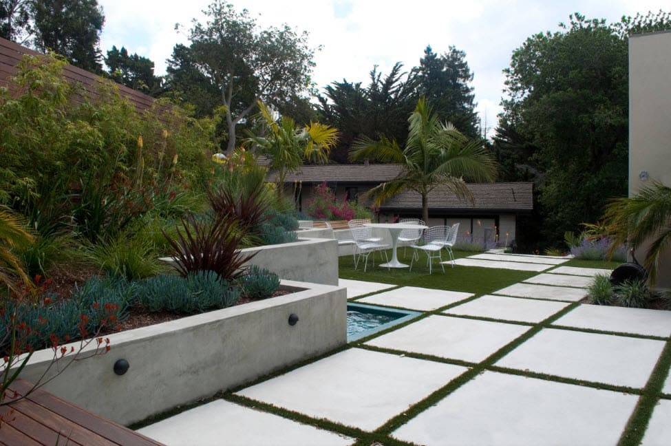— Стиль минимализм. Дизайн двора в этом стиле предусматривает очень тонкие линии, поэтому лучше всего использовать керамогранит под мрамор для оформления патио, низко стричь газонную траву и выбирать низкую мебель с изысканными формами. Нейтральная цветовая гамма, составленная из природных каменных и песчаных оттенков с добавлением белого и черного должна использовать как в отделке, так и в мебели. Сад в стиле минимализм лучше всего смотрится при доме с панорамным остеклением.