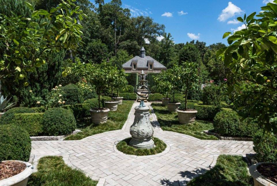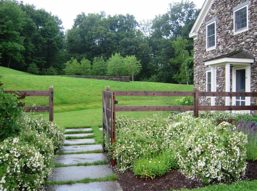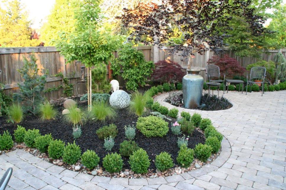 — Пейзажный стиль. Дизайн двора в пейзажном стиле выглядит иначе. В нем меньше структурированности, хотя посадки внутри самих клумб имеют аккуратную эстетику и выбраны строго по размеру кроны. Пейзажный стиль обычно включает в себя 5–10 клумб неправильной формы с плавными краями на территории всего участка, мягко перетекающих одна в другую, а дорожки выполнены из камня или засыпаны корой. Пейзажный стиль больше всего подходит под кирпичные дома.