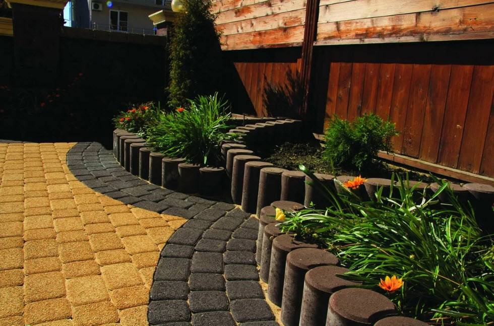Если использовать кирпичики разных цветов и укладывать их по определенной схеме, можно получить невероятной красоты ландшафтный дизайн. Круговая укладка, особенно из элементов разных цветов, может сочетаться с другими схемами вроде той же «ёлочки». Таким образом можно создать красивые цветы или просто геометрические узоры.