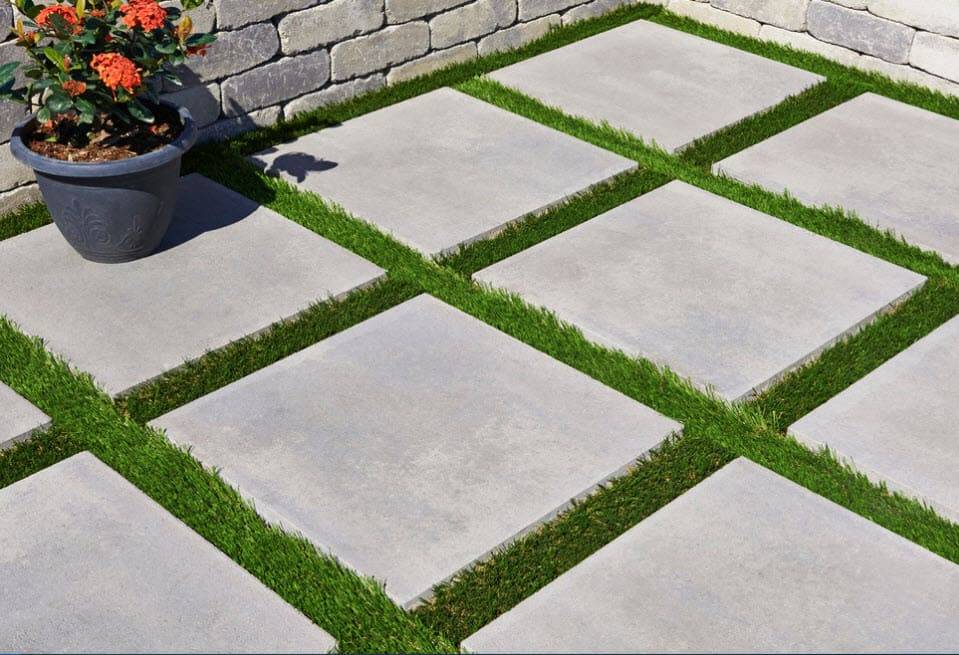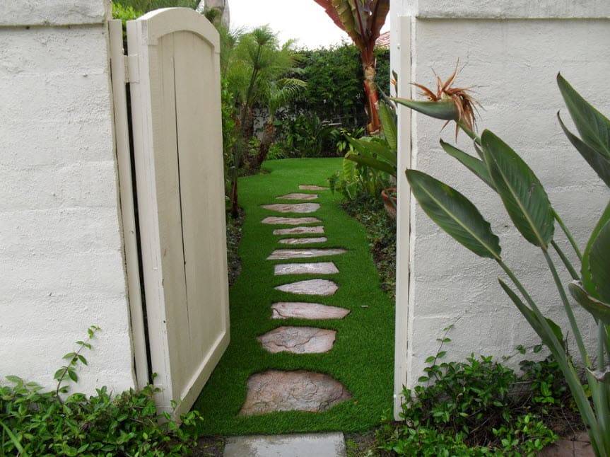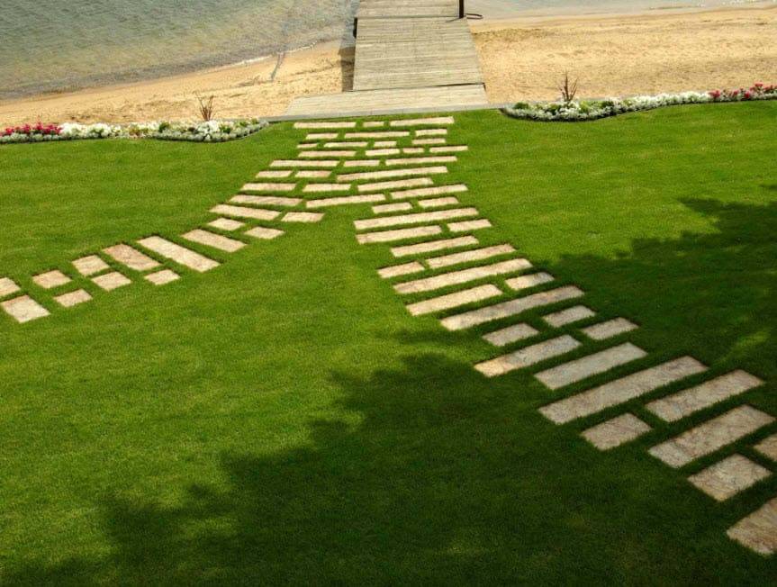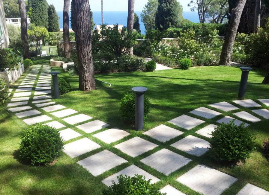 - Дорожка должна располагаться чуть выше газона, что позволит воде стекать с поверхности плитки.