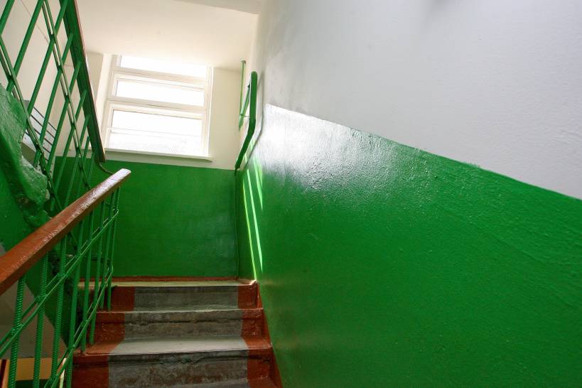Специальные составы наносят на лестничные марши, перила, двери, оконные рамы. Окрашивают коммуникации, почтовые ящики, мусоропровод, отопительные батареи.