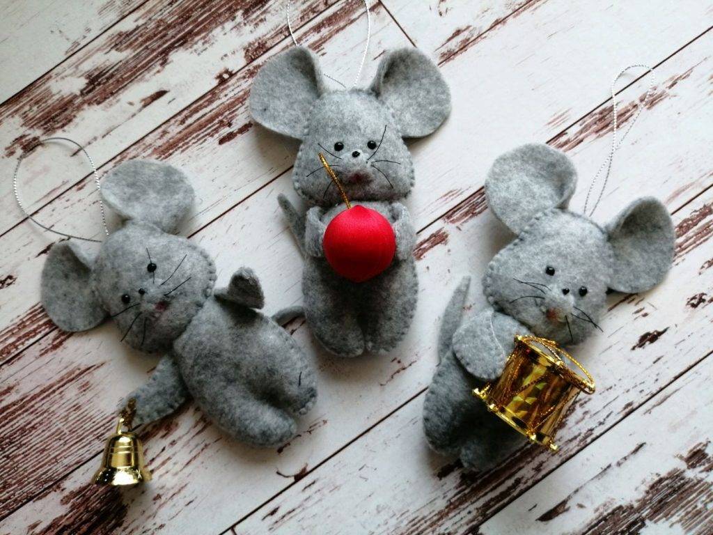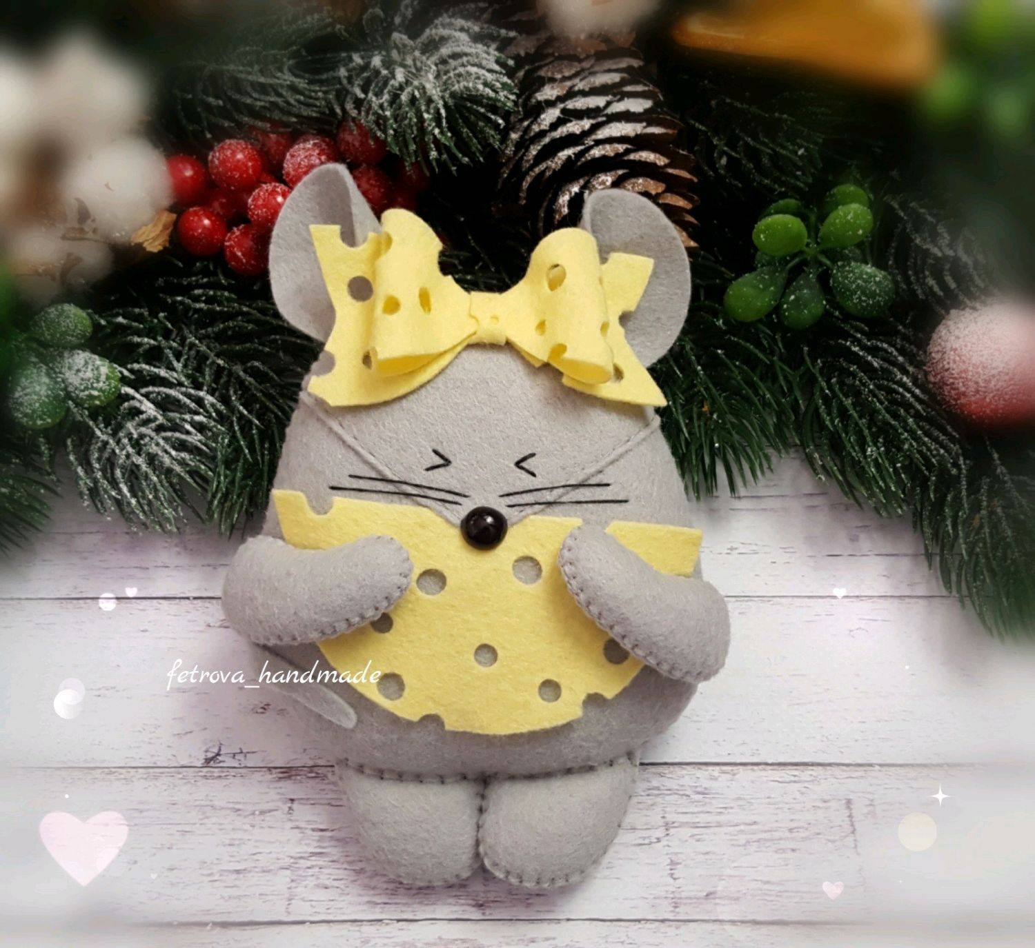 Запасаемся фетром серого и розового цветов, нитками и черными бусинками. Из серого фетра вырезается по контуру силуэт мышки, из розового материала ушки, пузо и носик (трафарет можно распечатать из интернета). Если мышь будет плоская, сборка проводится с помощью клеевого пистолета. Глазами послужат бусинки, усы вышивают черными нитками. Для объемной модели вырезается две части туловища и головы, которые сшиваются нитками (можно контрастными) и набивается тельце синтепоном. Уши и глаза приклеивают или пришивают. Милой игрушке в лапки дают кусок сыра (желтый фетр), еловую веточку или сердечко.