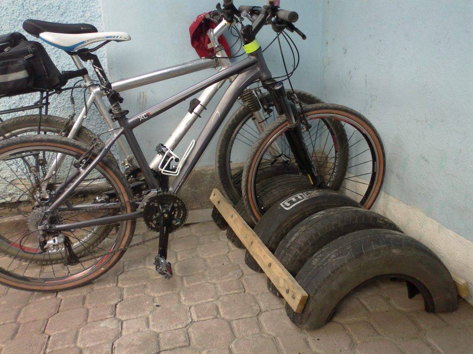 Это хорошая альтернатива металлическим конструкциям. Потребуется сделать около десятка парковочных мест. Расстояние между шинами должно совпадать с шириной колес или быть немного меньше. Вначале нужно определиться, где именно будут располагаться парковочные места. Для надежного крепления в земле выкапывается яма прямоугольной конфигурации. Покрышки фиксируются и покрываются землей ровно до середины. Свободную часть колец можно чем-то заделать, например, фанерными досками. Их следует окрасить под цвет шин. Сами покрышки тоже можно разрисовать. Если с импровизированной парковки убрать велосипеды, то получится интересное игровое место для детей. Для более надежной фиксации транспортных средств можно делать два ряда покрышек — для переднего и заднего колес. Шины можно будет использовать для физических упражнений.