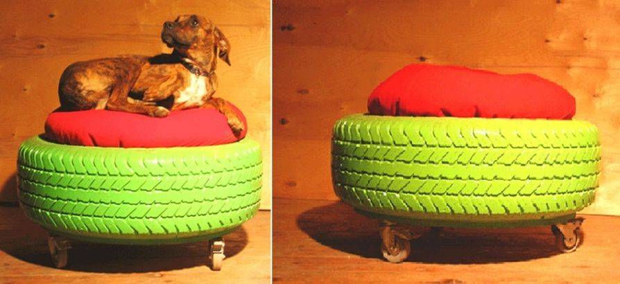 Поделка из шин может стать новым местом отдыха домашних животных. В центре готового изделия должна располагаться подушка. Ее толщина подбирается в соответствии с шириной шины. Для этого рисуется прямоугольная полоска. Ее протяженность должна равняться окружности покрышки. Затем на текстиле рисуются все детали подушки. Один элемент — длинный прямоугольник, два других — полукруги. Нужно помнить о припусках. Все детали вырезаются и сшиваются. Через отверстие внутренняя часть выворачивается, и после этого в подушку вставляется наполнитель — мягкая часть готова. Следующий шаг — декорирование шины. Она окрашивается гипоаллергенными красками без сильного запаха. В итоге останется только вставить мягкую часть в кресло. Покрышка готова к использованию в таком виде, но еще ей можно приделать ножки. Если лежанка предназначается для кошки, то шина в виде качели будет хорошей альтернативой обычной.