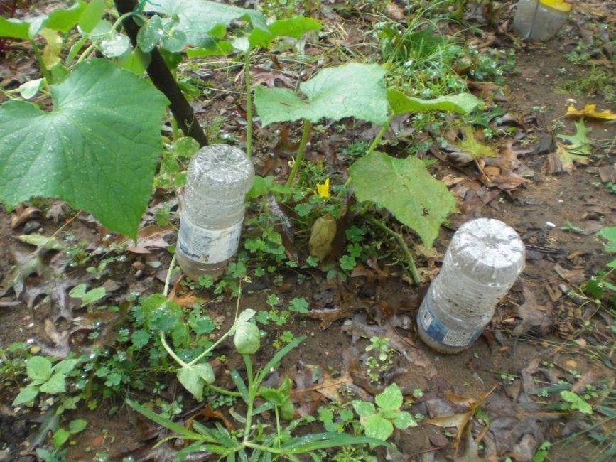 - бутылки темного цвета объемом 1.5-2 литра наполняют водой и закапывают на 1/2 высоты внутри короба по периметру;
