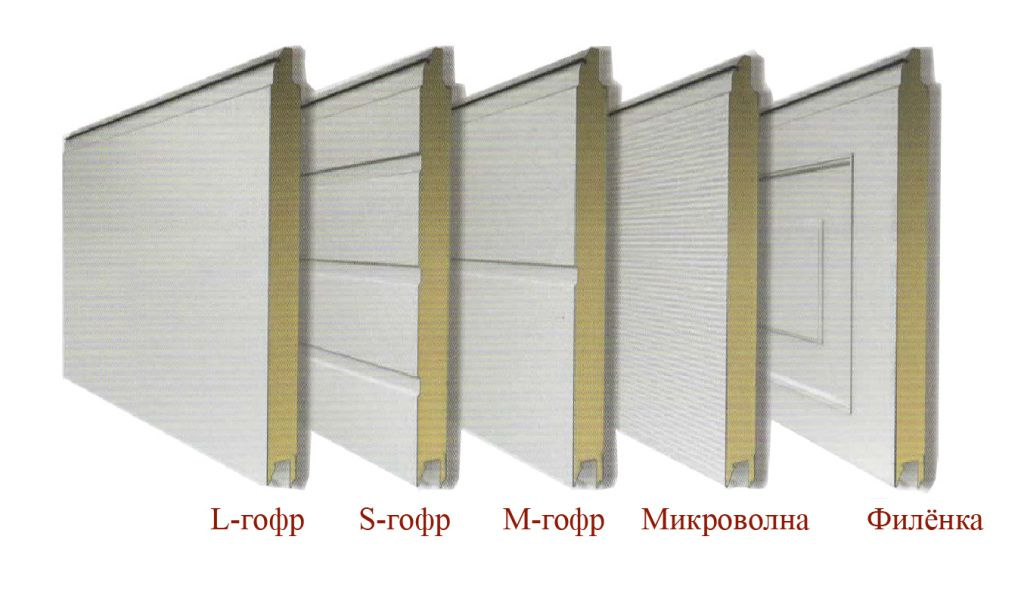 Благодаря использованию при производстве сэндвич-панелей цветовые и фактурные решения могут быть самыми разнообразными. Если цвет ворот будет темно-коричневым, то в качестве фактуры можно выбрать древесину. При этом производители указывают, что при выборе нестандартных решений, придется подождать время, которое превышает изготовление стандартной конструкции. Для красного, оттенка слоновой кости, белого и серебристого сроки выполнения обычные. Поверхность отдельных панелей полотна отличается не только по нанесенной фактуре, но и по рисунку. Выше на иллюстрации показано, какие варианты на заказ можно изготовить.