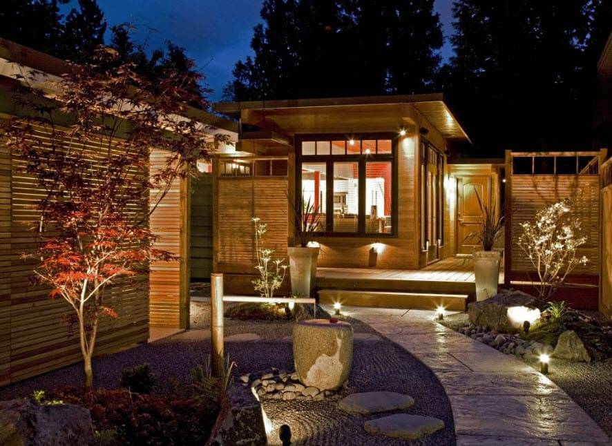 Главная задача представителей этой категории – подсветка садовых дорожек, подходов к гаражу и дому, крыльца. Это вопрос не столько декоративности, сколько безопасности передвижения в темноте. В этом аспекте оптимальным решением будет установка фонарей уличного освещения, дающих отраженный свет. Вход в дом и калитку зачастую обустраивают мощными источниками света с рефлекторами и датчиками движения.