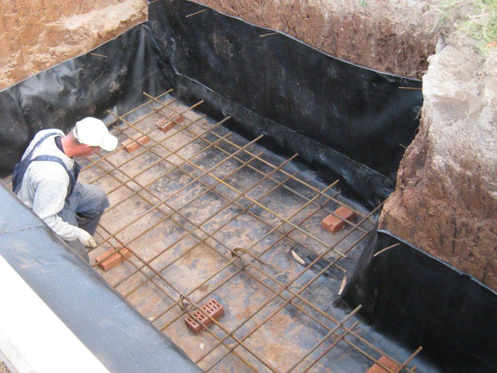 Если котлован небольшой, гораздо проще выполнить рулонную гидроизоляцию. Его полностью застилают рубероидом, склеив края битумной мастикой, как это сделано на фото. Но, предварительно необходимо произвести отсыпку основания песчано-гравийной смесью, с обязательной утрамбовкой. Толщина подушки должна быть не менее 15 см. Какие материалы выгоднее использовать для заглублённых стен, мы расскажем в следующей главе