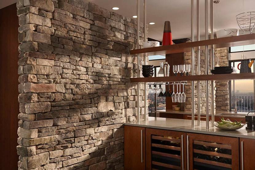 Искусственный камень хорош в обрамлении арок, открытых дверных проёмов, оконных рам. В просторных помещениях такой плиткой может быть отделана целая стена или куски акцентов на двух смешных поверхностях.