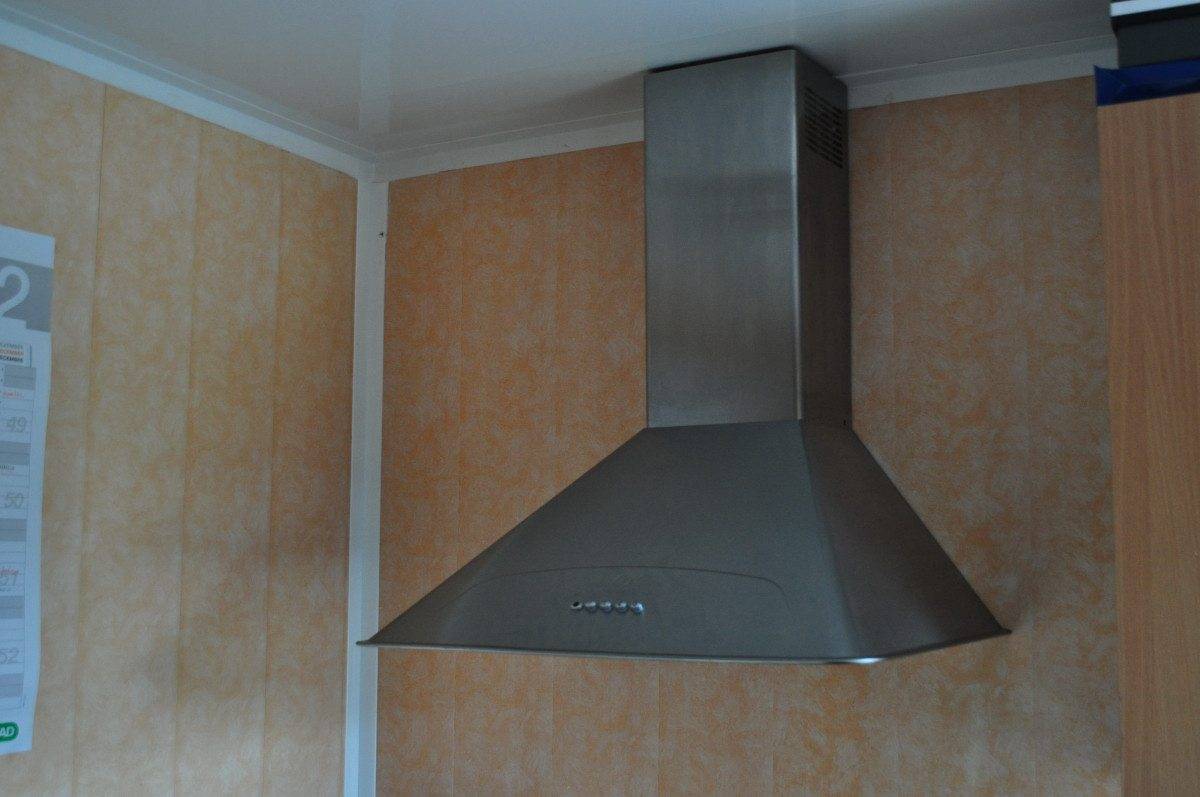 В панельном потолке можно легко скрыть различные линии коммуникаций, например воздуховод вытяжки