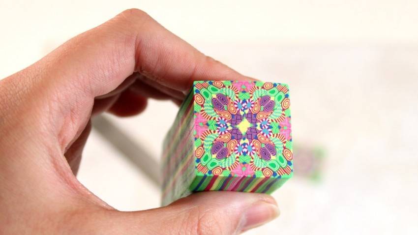 - Техника трости – раскатанные кусочки глины в разных сочетаниях цветов выкладывают слоями и скатывают в форме рулетов, на срезе которых получаются оригинальные разноцветные узоры.