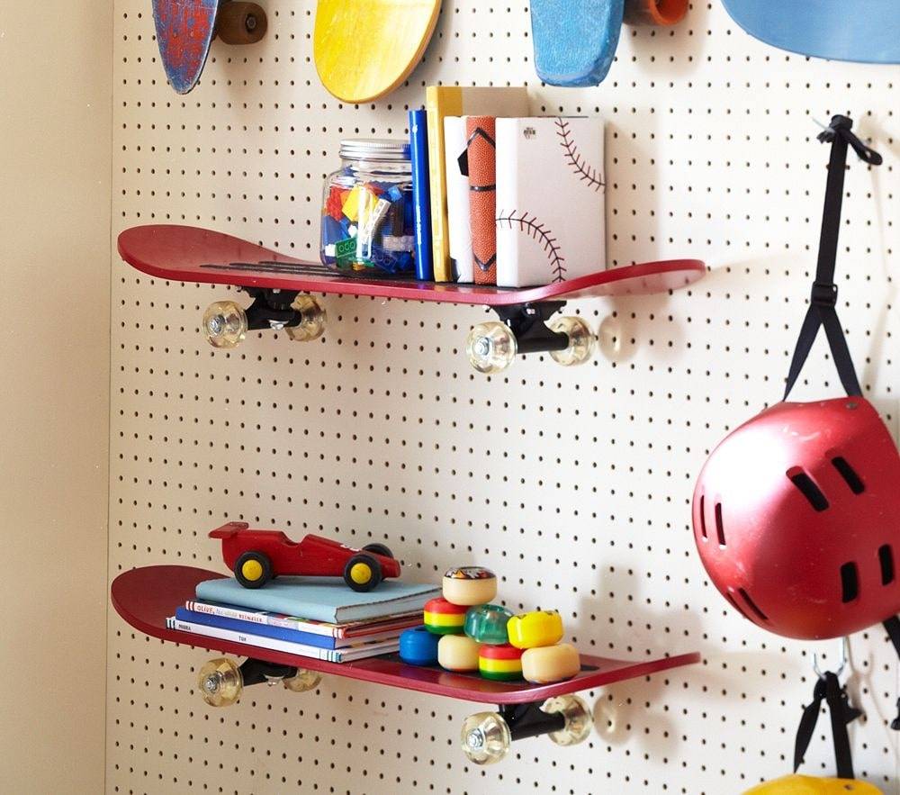 Пегборд представляет собой перфорированную панель, на которую устанавливаются крючки и держатели полок, контейнеров в произвольном порядке. Вполне подойдет для установки книжных полок над рабочим столом в детской или личном кабинете. Можно встретить в оформлении интерьера кухни и гостиной, смотрится довольно оригинально.