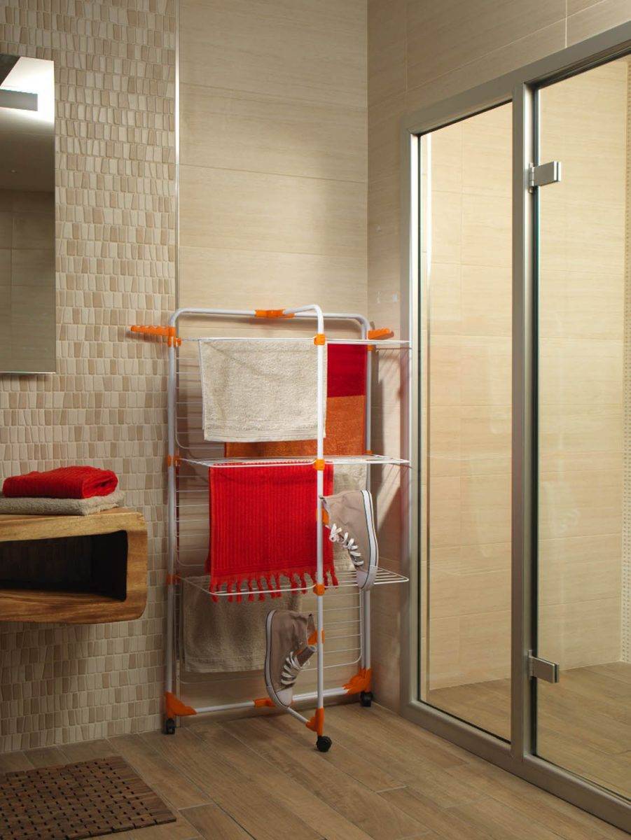 - сушилки складного типа, устанавливаемые на полу помещения. Они занимают довольно много места и плохо подходят для малых по площади комнат;