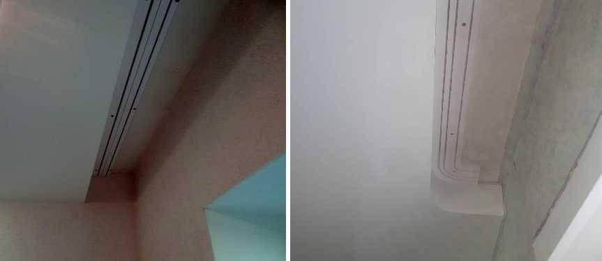 Такой монтаж можно считать наиболее оптимальным в поисках решения задачи, как вешать гардину на потолок. Крепление потолка в этом случае выполняется не к плоскости стены над оконным проемом, а к профилю, который прочно зафиксирован на потолке на определенном расстоянии от стены. Карниз для штор устанавливается на основном потолочном перекрытии, при этом он становится недоступным для взгляда из комнаты. Чтобы не причинить вред полотну натяжного потолка, карнизы устанавливают непосредственно перед натяжением пленки или ткани.