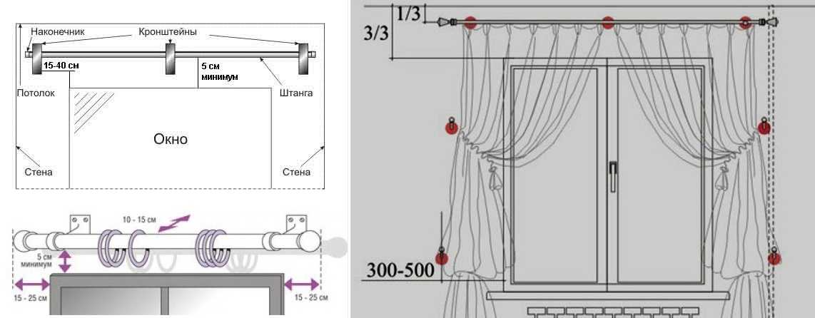 Перед тем как повесить карниз для штор на стену, надо определиться с расстояниями. На каком расстоянии от потолка его установить? Лучше всего шторы смотрятся когда от карниза до потолка 1/3 от всего расстояния между окном и потолком, а до окна — 2/3. При этом надо помнить, что минимальный зазор от окна — 5 см.
