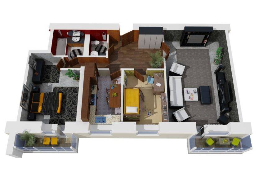 Если один из членов семьи работает в домашних условиях, то в этом случае в таком жилье не обойтись без рабочего кабинета. Размеры трехкомнатных жилых помещений могут варьироваться от 56 до 80 и более квадратных метров. Небольшая по размерам квартира занимает 60-63 м2.