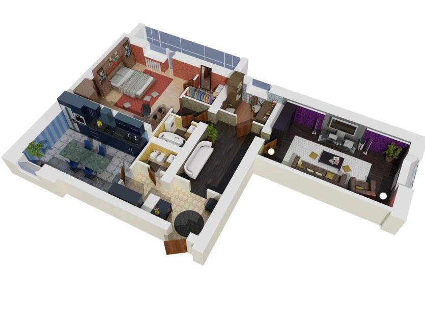Трехкомнатное жилье также может иметь и угловое расположение. В этом случае одна из комнат становится проходной и ее обычно превращают в гостиную. В этом случае часто совершают перепланировку такой квартиры.