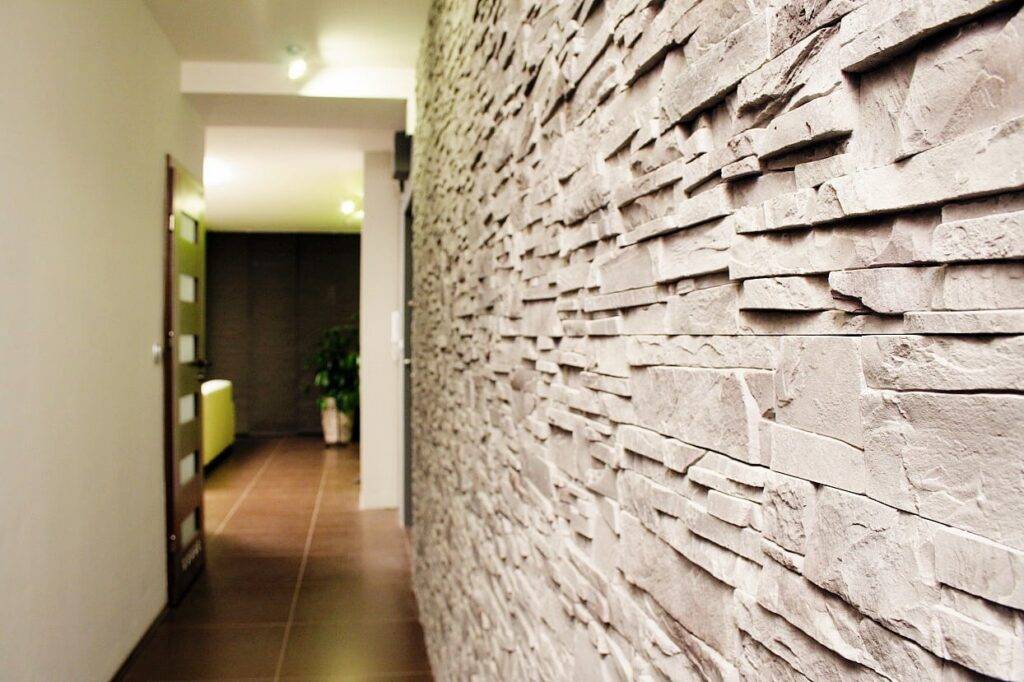 Декоративный камень на стене — это решение, которое часто используется в современном дизайне прихожей. Интересной идеей также является их сочетание с терракотой на полу. Залог успеха в этом случае — правильное сочетание цветов. Темный декоративный камень в коридоре будет отлично смотреться, если использовать один оттенок как для пола, так и для стен. Такое сочетание хорошо смотрится в просторных интерьерах — узкая прихожая с черным или темно-серым декоративным камнем может выглядеть даже меньше, чем есть на самом деле.