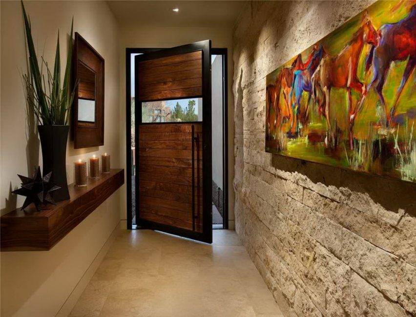 Длинная и узкая прихожая нуждается в светлых оттенках — это очевидно. Здесь возникает вопрос о естественном освещении, если есть окна и свет попадает в прихожую прямо или косвенно, отделка камнем может иметь несколько более темные или более интенсивные цвета.