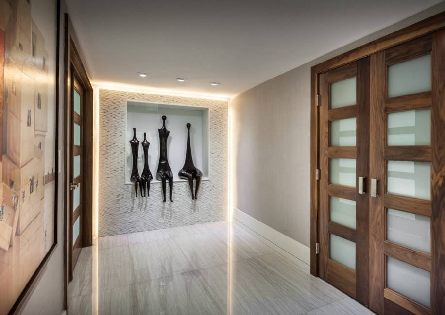 Сгладить пропорции помещения можно за счет правильного комбинирования напольного покрытия, отделки стен и потолка. Для этого на длинных стенах можно повесить красивое зеркало или наклеить фотообои. Это поможет скорректировать внутренний объем прихожей. Вместо межкомнатных дверей лучше сделать в дверных проемах арки. Для окраски длинных стен лучше использовать светлые цвета, а для коротких – темные. Такое оформление позволит зрительно сделать комнату квадратной.