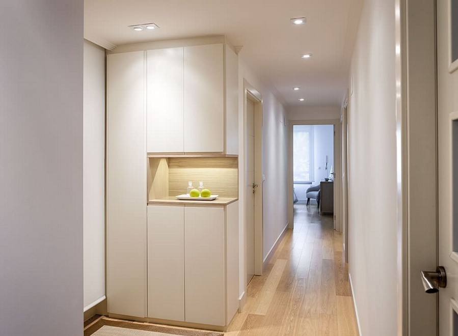 Визуально исправить форму прихожей можно, если правильно разместить светильники. Фото дизайна красивых прихожих помогут разобраться с оформлением помещения и подобрать оптимальный вариант.