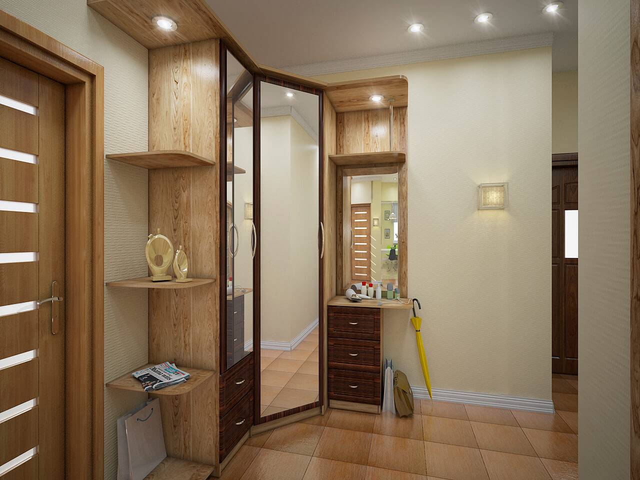 Небольшое замкнутое пространство невыгодно выглядит с точки зрения эстетического, визуального восприятия. Снос перегородки или максимальное расширение, а также демонтаж дверного проёма позволят раздвинуть площадь. Исчезнет эффект замкнутого пространства, появится возможность разместить больше мебели. Зонировать комнаты помогут открытые полки с подсветкой. В большинстве «хрущёвок» прихожая настолько маленькая, что нет возможности поставить полноценный шкаф-купе глубиной 60 см, даже 40-45 см. Выходом станет угловой шкаф со скошенными угловыми сегментами для удобства передвижения. Вместо снесённой перегородки можно установить одну из мебельных секций.