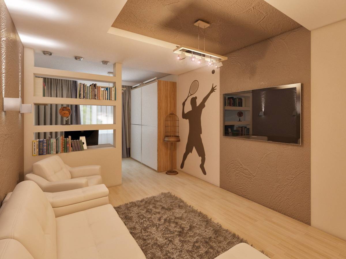 Спрятать кровать можно за ширмой, перегородкой из гипсокартона, занавесками, стеллажом, а остальное пространство отвести под гостиную с вместительным уютным диваном, ТВ-тумбой и журнальным столиком. Телевизор может быть закреплен на поверхности перегородки, отделяющей спальню от гостиной. Вышеописанный вариант зонирования возможен в просторном помещении, но если комната маленькая, то объединение двух зон становится более тесным – кровать заменяют многофункциональным диваном-трансформером