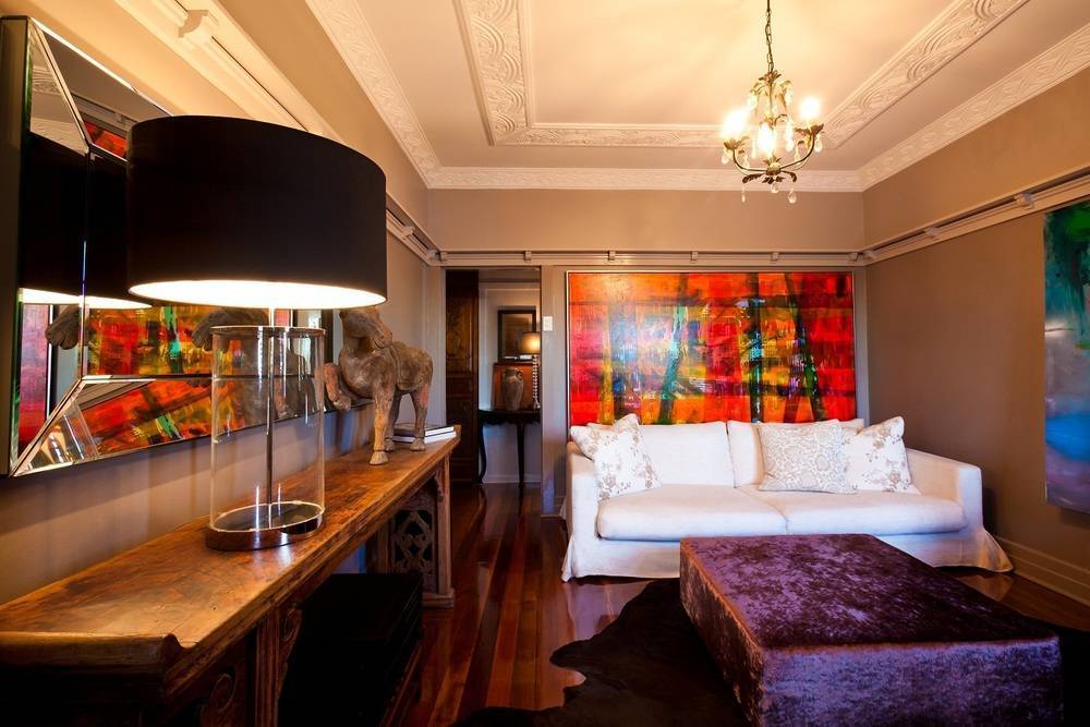 Чтобы дизайн гостиной в стиле арт-деко выглядел завершенным, без аксессуаров не обойтись. Утонченные силуэты юных девушек, с их легкостью и грациозностью, отраженные в скульптурах или живописи; картины с абстрактными или животными мотивами, настенные часы, большие вазы. Для множества мелких статуэток или коллекции предметов удобно приспособить шкаф-витрину с прозрачными дверцами.