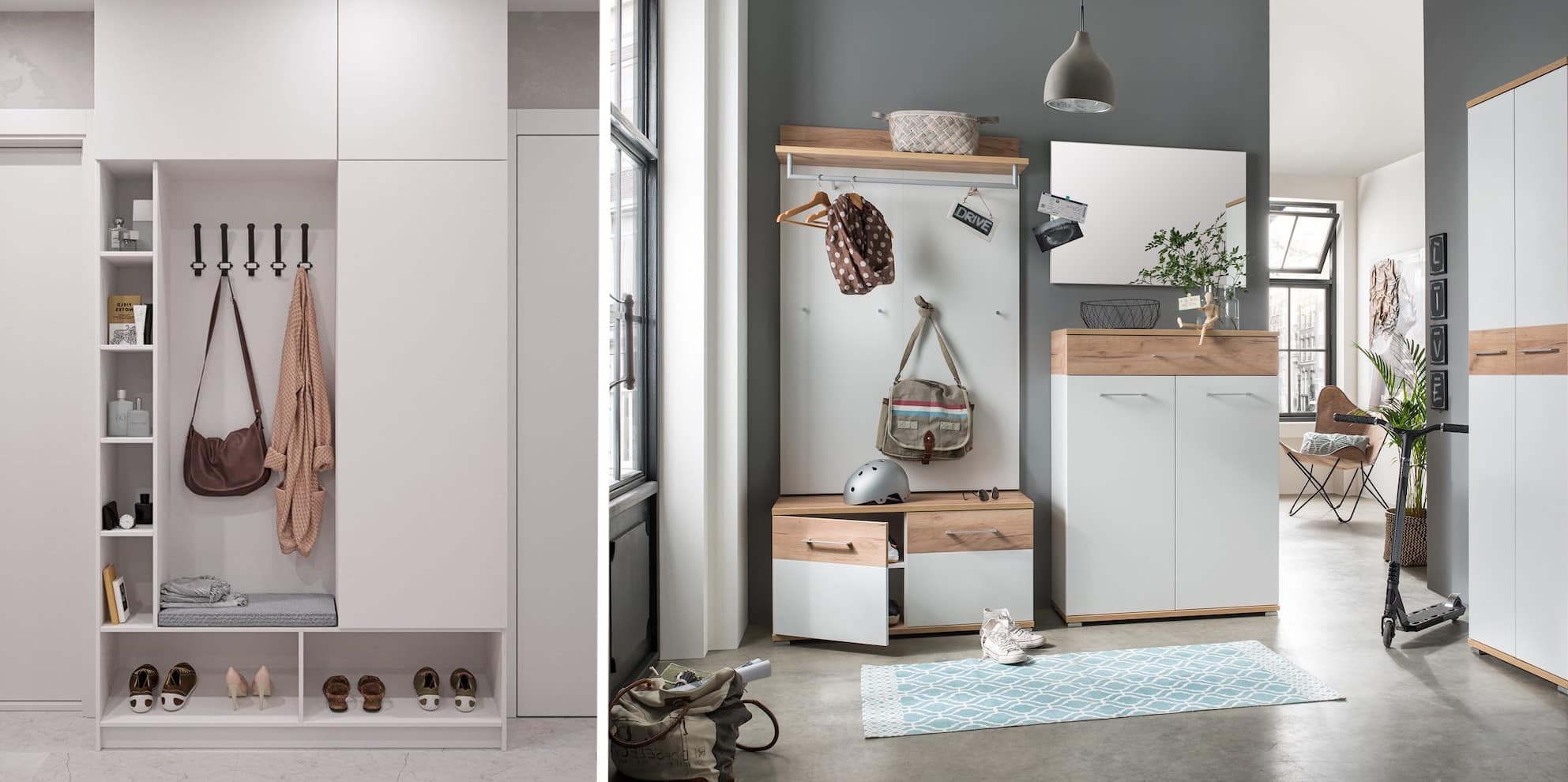 - Не следует загромождать прихожую мебелью. Достаточно поставить шкаф-купе, если для него есть место. Он отлично справится и с функцией зонирования. Если места мало, то можно использовать вешалки, ящики, полки.