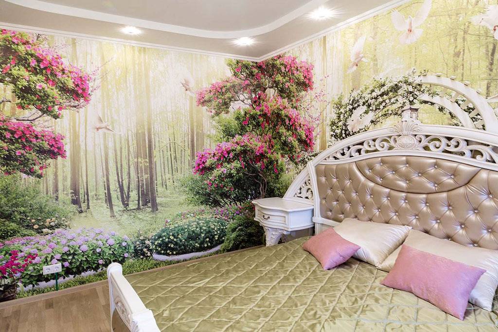 Угловая отделка, или оклеивание двух соединяющихся стен поможет стереть угол, создавая ощущение свободного пространства. Более смелым решением будет оформление изображениями четырех стен сразу, при этом цвета должны быть яркими, не кричащими, гармонично вписываясь в остальную обстановку.