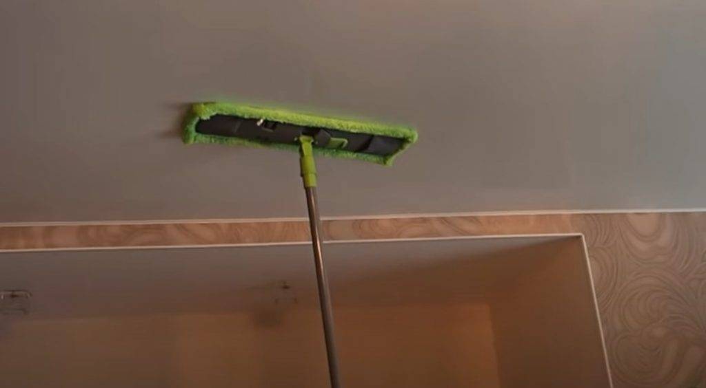 Лучше всего почистить потолок со стремянки тряпкой, но это не всегда удобно. Допустимо использовать телескопическую швабру с микрофиброй, если расстояние до чернового перекрытия больше 5 см (иначе полотно продавливается и может повредиться о неровности базового потолка).