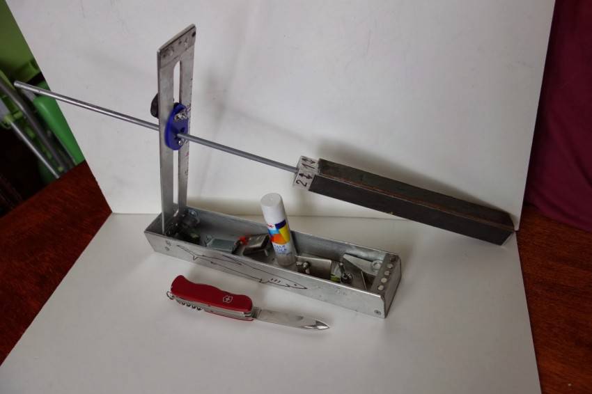 Существуют и довольно сложные приспособления. Для их создания понадобятся некоторые материалы, инструменты и немного времени, но вы надолго обеспечите себе удобное средство для заточки. Сборка устройства осуществляется из таких материалов: