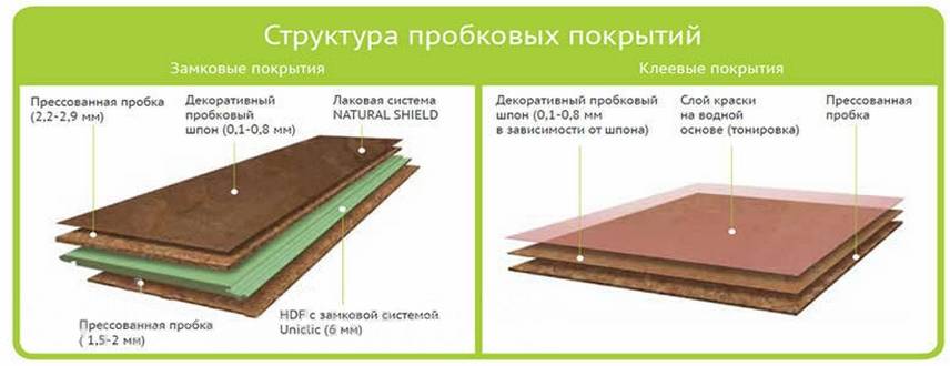 Замковая пробка на пол имеет многослойную структуру. Внизу располагается прессованный агломерат. Затем следует полотно МДФ, ХДФ, на котором крепятся замковые соединения. Далее идет пробковый слой, выполняющий функцию защиты для МДФ. Верх плиты представляет из себя древесный шпон, покрытый тонкой виниловой пленкой или лаком.
