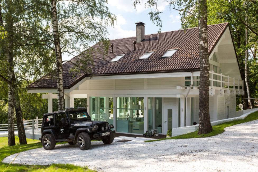 Так вы будете защищены от посторонних глаз. В коттеджах, стоящих в глубине участка, скрытых от посторонних глаз зеленью деревьев, расположение выносной конструкции не имеет принципиального значения.