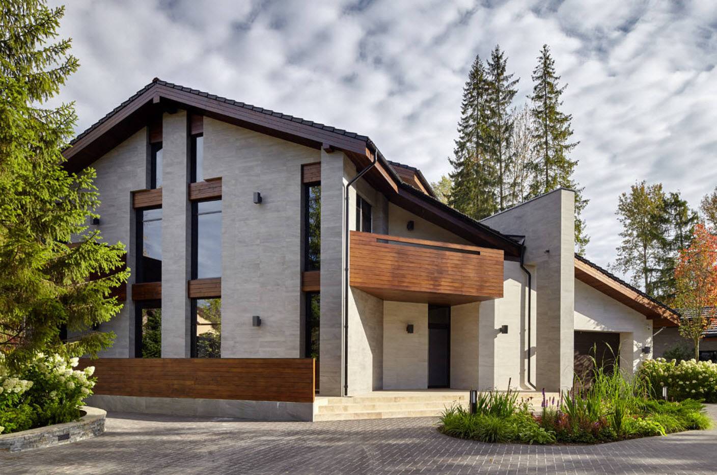 Небольшая терраса и балкон в коттедже, построенном в русском стиле