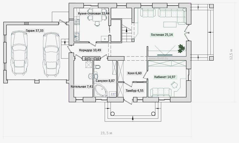 Гараж подходит для достаточно крупных участков, так как его размеры – 12,3*8 м. На этом пространстве удалось разместить следующие зоны: