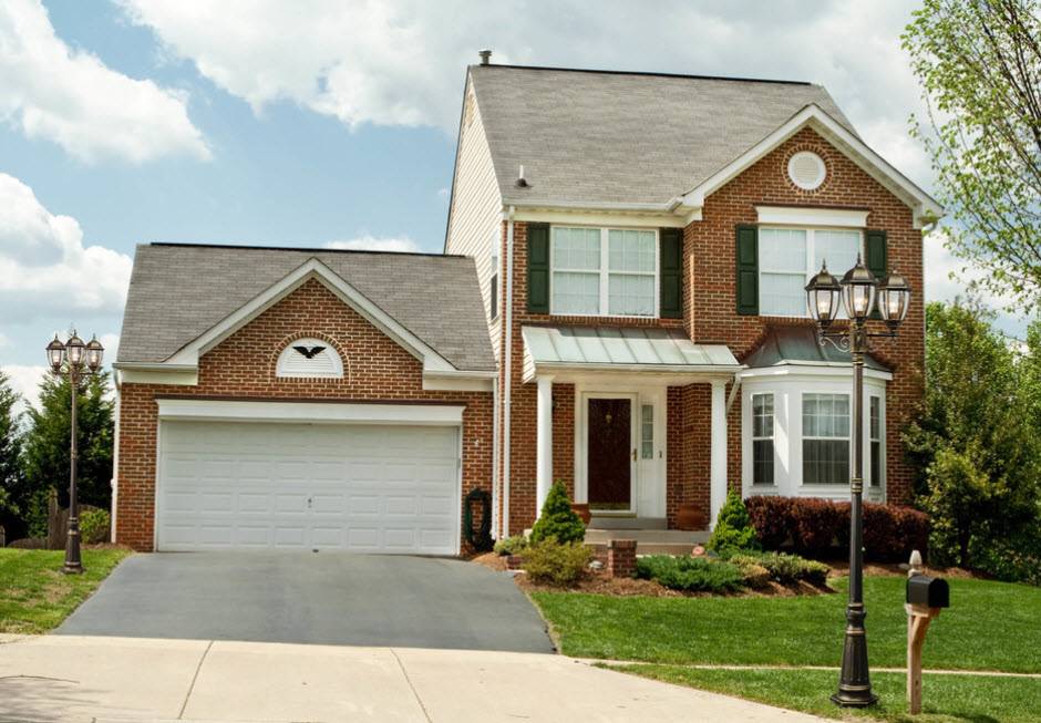 Размещенный на ровном ландшафте гараж, совмещенный с домом, имеет крышу двускатной конструкции