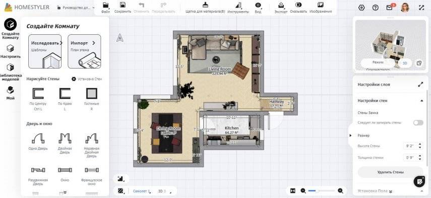 — это бесплатный онлайн-инструмент, который помогает создавать планы этажей и помещений. Имеет простой интерфейс, так что разобраться в нем будет не трудно. При выборе плана этажа сразу выбирается стиль комнаты.