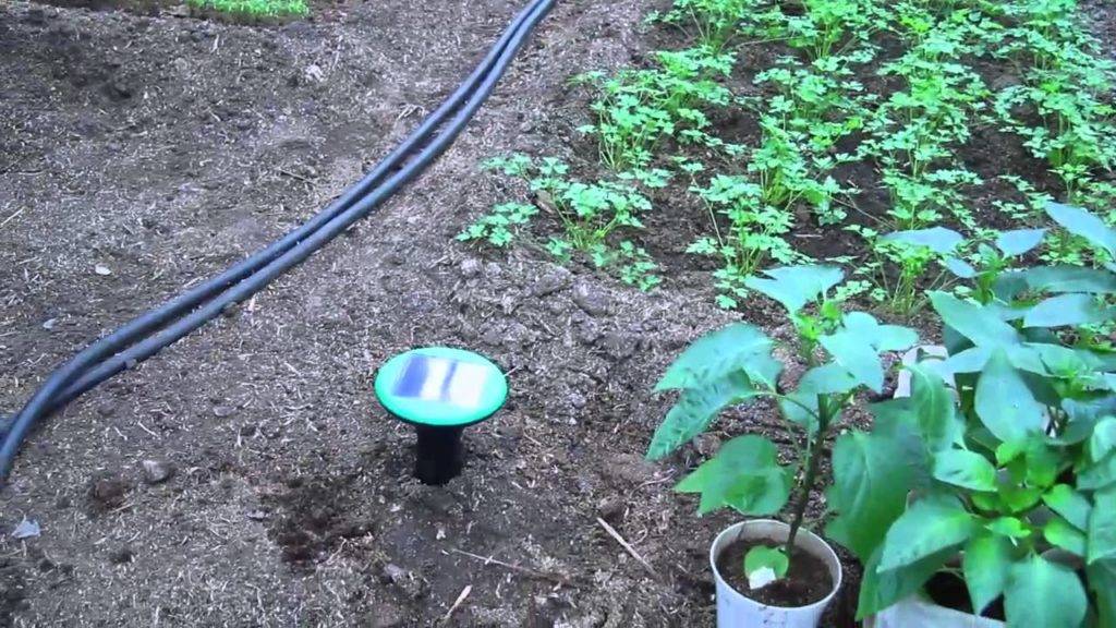 К сведению! Устанавливаются отпугиватели на солнечных батареях по той же схеме, что и прочие модели: их аккуратно заглубляют в почву, оставив над поверхностью шляпку.