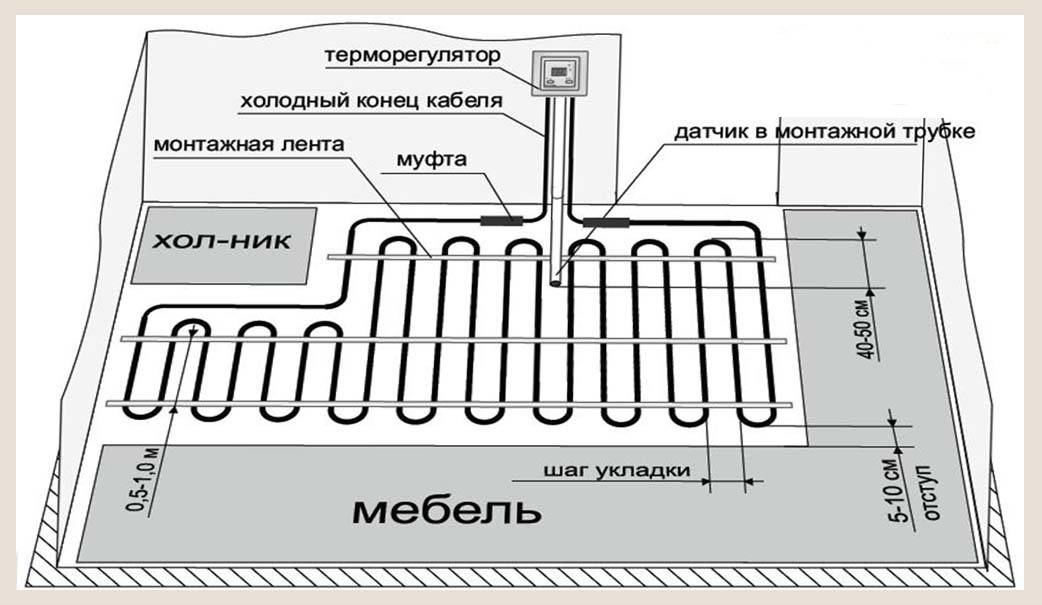 Устанавливать терморегулятор рекомендуется на высоте от 15-20 см, над уровнем чистового покрытия.
