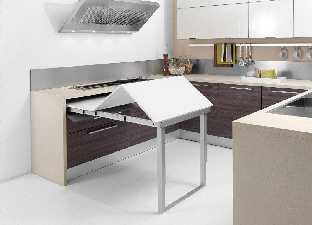В сложенном состоянии он маскируется под фасад ящика или дверцы шкафа или прячется под основной столешницей. Его популярность меньше предыдущих, т.к. выполнить конструкцию можно только под заказ или смастерить самостоятельно.