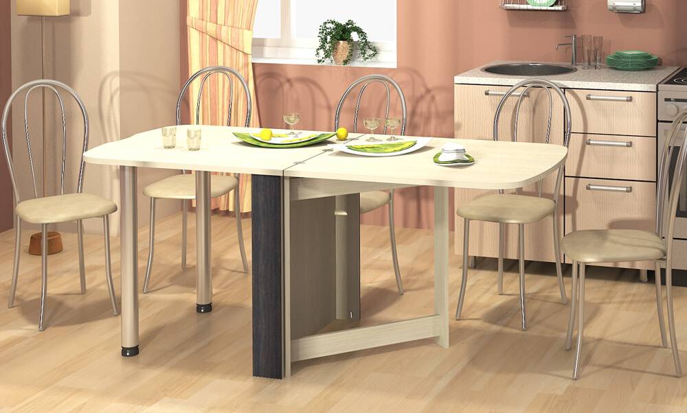 Он может иметь различный механизм раскладки. Современные конструкции, как правило, удобны в обращении: быстро превращаются из миниатюрного столика в просторный обеденный стол на 4-6 персон. Справится с ним даже ребенок.