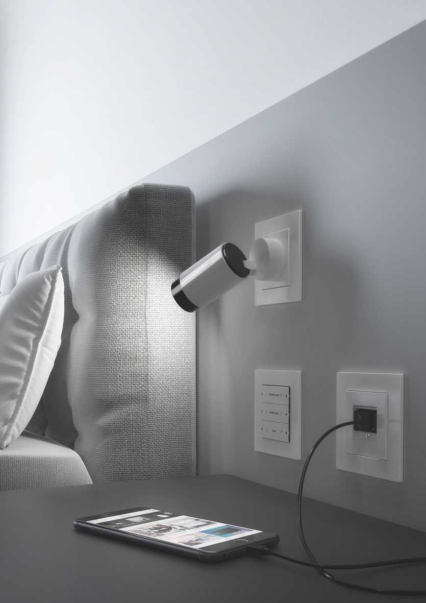 Основное назначение такой точки подключения – это снабжение электроэнергией настольной лампы или бра, если они не подключены скрытой проводкой. Кроме того, у кровати удобно включить ночник, зарядное устройство для телефона или планшета и ноутбук. Ставят их в 10 сантиметрах над столешницей. В одном блоке с розетками обычно монтируют и выключатель для бра и для общего освещения, чтобы перед сном не приходилось вставать для выключения освещения. Запасная розетка точно не будет лишней – в нее удобно будет включить часы-будильник или терминал метеостанции.
