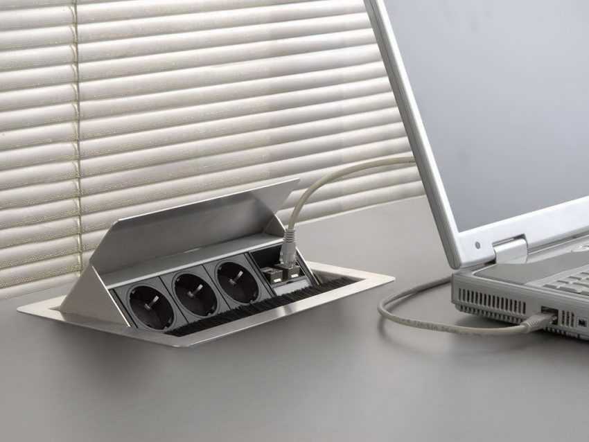 - Встроенные розетки. Монтируются они непосредственно в стол или другую поверхность. Особенностью таких розеток является то, что их можно легко спрятать. Это идеальный вариант для людей, которые предпочитают максимальную функциональность и практичность.