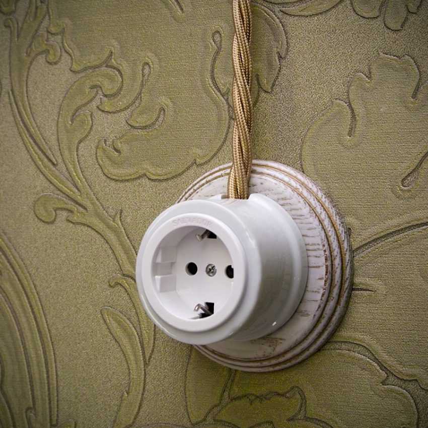 Такая интерьерная стилистика предполагает округленные очертания и довольно крупные размеры, потому и розетки в приведенном случае обязаны быть солидными по размерным параметрам (прямоугольными, круглыми либо квадратными).